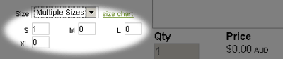 - From the Size dropdown, select 'multiple sizes'. Quantity boxes display all available sizes for that product.